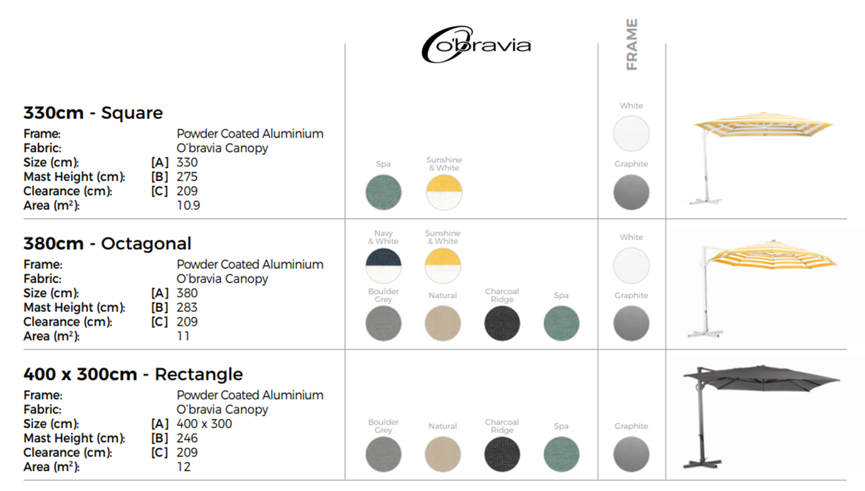 The Savannah features a number of design innovations, including a drop down bracket on the umbrella hub for LED light attachment. Most importantly, Savannah is covered in fade resistan properties, exceeded only by Sunbrella acrylic. Savannah has an impressive oval section mast and a 360 degree rotate (with foot lock), press button tilt lock, crank lift opening and resin base options. Includes Protective Cover.