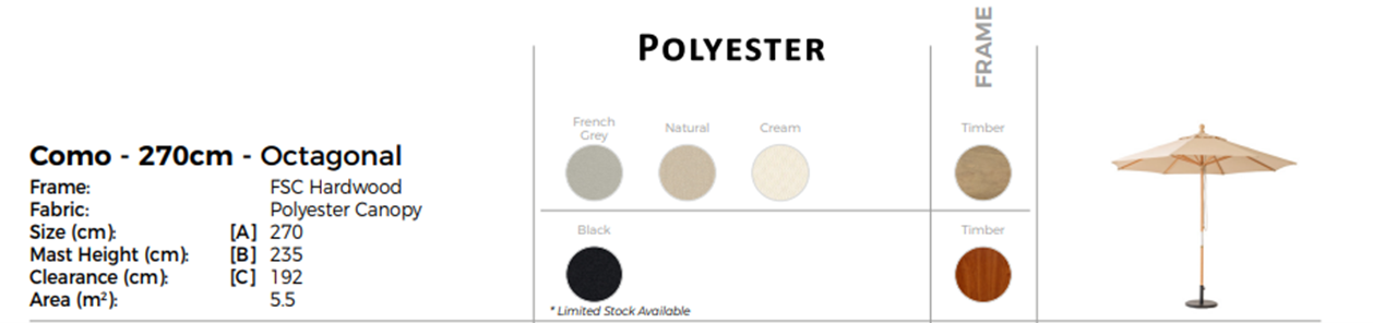 The Como is part of our Market umbrellas, manufactured in high quality hardwood. The Courtyard range features a pulley / cord opening and silver trim components to give a superb finish touch.