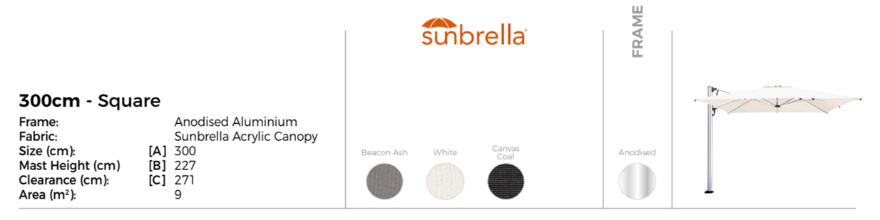 Siena is a revolutionary new addition to our Cantilever range. It features a gas lift that makes opening and closing simple, and an effort-less process. No ropes, no pulleys, no winders. The track locks the canopy in both the open and closed positions. A Sunbrella solution dyed acrylic wind vented canopy, mounted on a silver anodised frame will guarantee many years of trouble free service. A simple lever action allows rotation through 360 degree, in 10 fixed positions. Includes a 210gsm PU coated polyester cover for added protection from the elements when the umbrella is not in use.
